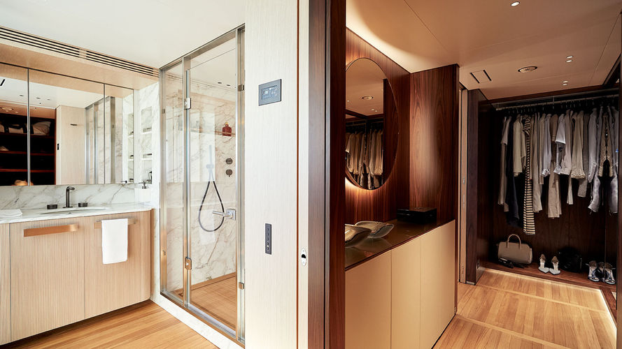After your yoga session on the main deck, start your day at the sky lounge breakfast bar on the upper deck, while you enjoy your cup of coffee / smoothy, the V&J specialist will take you through the planning of the day completely designed on your inspiration and destination. One of the most extraordinary features of Rebeca is her beach terrace what is massive with a unique fold-out wings either side that really push the boundaries of space potential on a 40m yacht. The inviting glass infinity pool is almost at sea level, creating the illusion of sea bathing with the reality just a few steps away. There are plenty of water toys and the deck crew will help you get the most out of every one of them. For a more sedate ocean experience, a hydraulic bathing platform makes the water safely accessible for all.