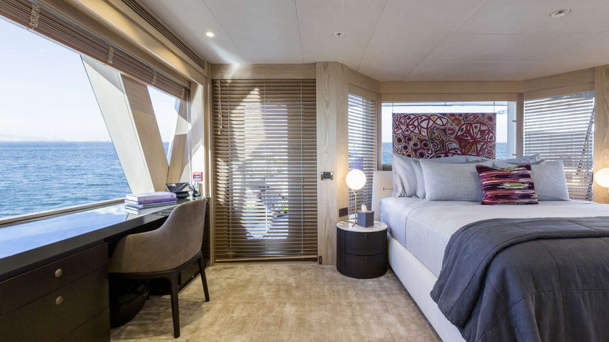 This custom expedition yacht features sophisticated exterior design and engineering by Gregory Marshall. The spacious living areas are each decorated with beautiful interior pieces, surrounded by full-height windows the warm colours of Australia accent an interior which is at once strikingly modern, and invitingly luxurious. A generous owner’s suite stretches full beam across the main deck, and four guest cabins complete the accommodation, with room for 10 live-aboard guests housed in vibrant, individual spaces.