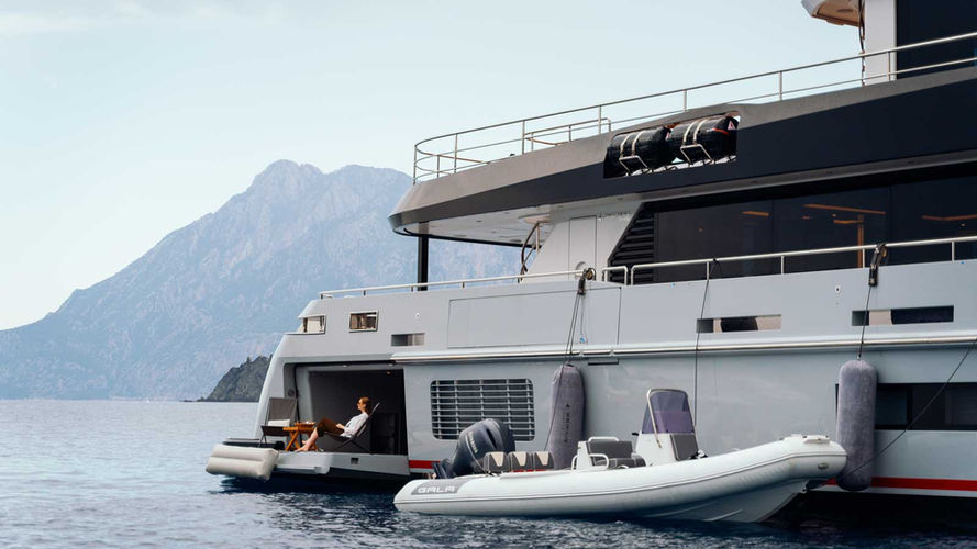 Her expansive main saloon is the perfect place for gathering with family and friends and also doubles down as a formal dining area for mealtimes, with a second dining area located on the upper deck, in the sky lounge. Al fresco dining can be experienced in three different areas, on the main, upper or sun decks. Down aft there is a 40 square-meter beach club with large opening sea terrace door and access to the stern platform which incorporates a high/low swimming ladder. The beach club has a Hammam for guest use as well as relaxed informal seating.