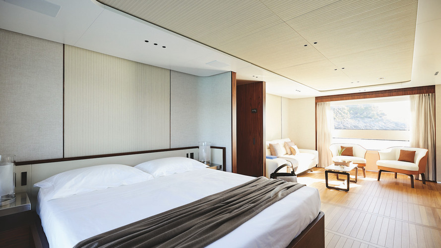 After your yoga session on the main deck, start your day at the sky lounge breakfast bar on the upper deck, while you enjoy your cup of coffee / smoothy, the V&J specialist will take you through the planning of the day completely designed on your inspiration and destination. One of the most extraordinary features of Rebeca is her beach terrace what is massive with a unique fold-out wings either side that really push the boundaries of space potential on a 40m yacht. The inviting glass infinity pool is almost at sea level, creating the illusion of sea bathing with the reality just a few steps away. There are plenty of water toys and the deck crew will help you get the most out of every one of them. For a more sedate ocean experience, a hydraulic bathing platform makes the water safely accessible for all.