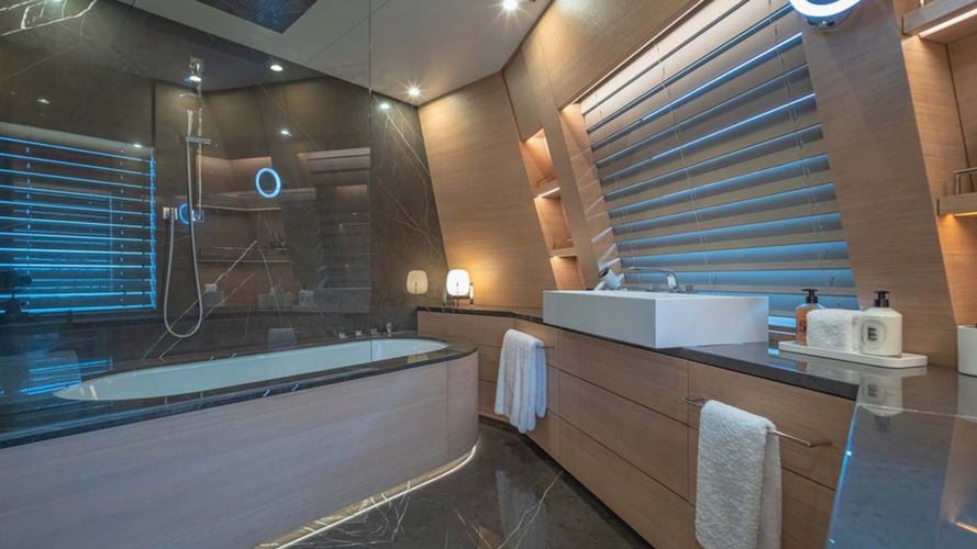 Her cruising grounds are around the Indian Ocean and the South Pacific what are world-class dive locations. With an aft deck of 30m long that creates a massive 400sqm space, she is the most ideal platform for scuba diving and snorkelling, where we can design the most epic dive expeditions for the avid lovers of the underwater world. You are guaranteed to enjoy bountiful, healthy reefs, abundant marine life and bucket-list pelagic. This is also where two of the yacht’s three tenders, a 7m beach lander and an 8.3m Explorer, are stowed. The third is a Windy SR52 chase tender, with these tenders to your disposal we can really create epic island excursions. Believe it or not, the sides of the aft deck can fold down to open up the aft deck completely and create even more versatile space for entertainment, relaxation, games like basketball, table tennis or a golf driving range with fish-food balls. Behind the aft deck you will find an incredible beach set-up for the water sports days. With her zero speed stabilisers she creates an unbelievable comfort for her toy locker packed with Sea-Doos, Sea Bobs, sailing dinghies, flite boards, transparent kayaks, paddleboards and a host of tow toys, truly an unbeatable package.